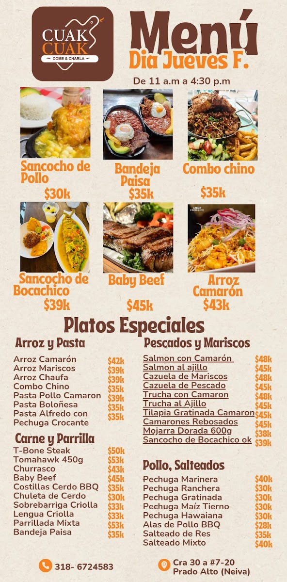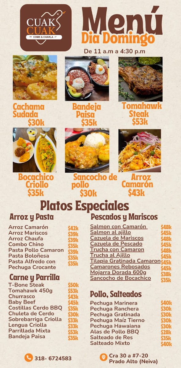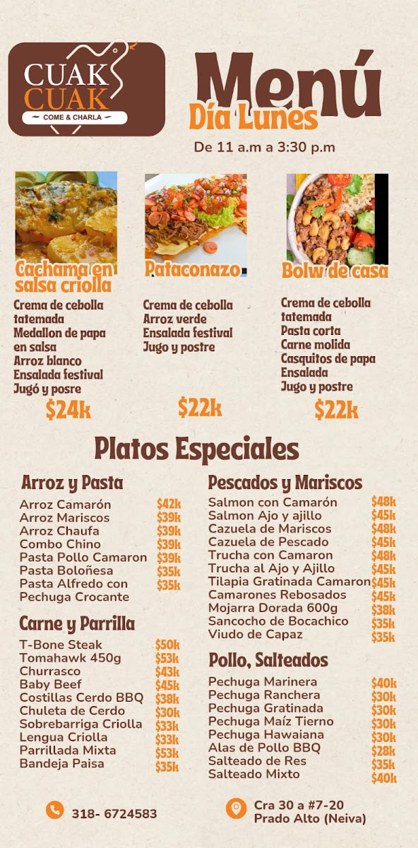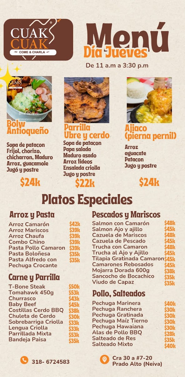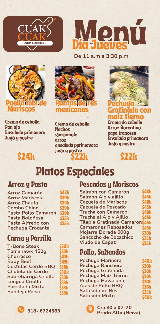 Overall, Restaurante Cuak Cuak presents a diverse menu filled with bold flavors and comforting classics that make it a great choice for anyone seeking an authentic Colombian dining experience.